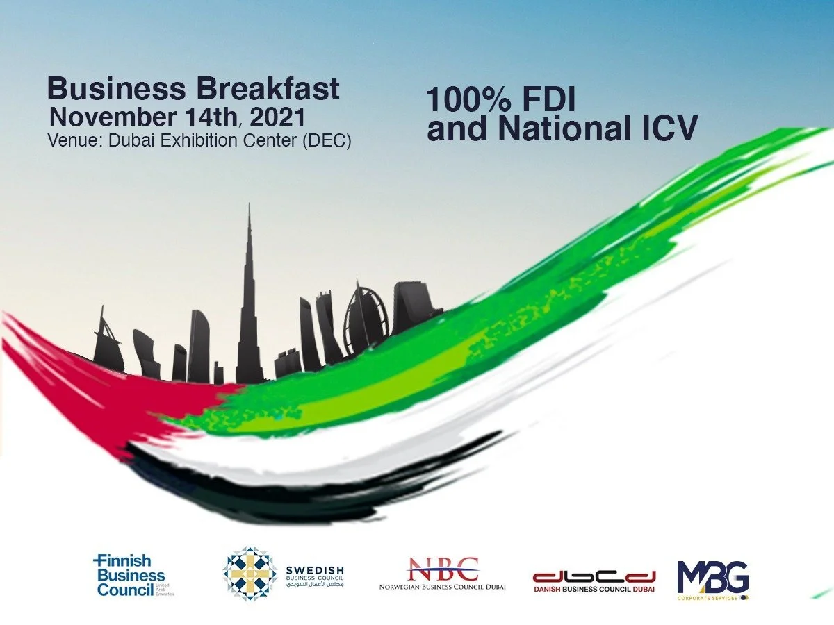 Welcome to the Business Breakfast which will cover the new law of 100% Ownership and National In-Country Value Program (ICV) and which is organised jointly with MBG Corporate Services and the Nordic Business Councils. The event will take place at the new Dubai Exhibition Centre, right by Expo 2020 Dubai.